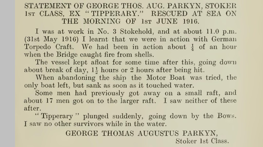 As an example, one person whose details I wish to share is of my maternal grandfather, George. I never met him personally, as sadly he passed away a good few years before I was born but I have learned much about him, thanks to the Internet! George was born in Truro in 1884 and he was christened there early the following year. Then in 1889 a brother named Samuel was born. Truro was quite a prosperous mining area, but at the time of the Census in 1891, the family had moved over to Bury St Edmunds in Suffolk, most likely for the chalk mining. At some point things changed though, as in June 1900 George was registered as a ship’s boy aged 15 on board the R.M.S. Ortona (image above) in Tilbury Docks, London. I found his contract ended less than four months later. Over the next twelve months or so he was crewed on other ships, these being the Orizaba and the Wakanui, doing trips between England and Australia/New Zealand. Then in July 1902 he joined the London and South Western Railway, I don’t know in what job though. But a year later he left them without giving any notice and three days later George signed on with the Royal Navy. He was now aged 18 and a Stoker on HMS Nelson and at that time his character was marked as ‘very good’. Around eighteen months later he transferred to HMS Mars at the same rank and character, however some six months later there must have been something occur as he spent ten days in the cells! But his character was still marked as ‘good’. A few days after his release and return to HMS Mars, he was transferred as a Stoker to HMS Victory II. Two months later he was transferred to HMS Fox, but nine months later George was promoted to Stoker 1st class, a grade which he retained over the next four years. But from what I can find out, his weight increased and as a result his term of duty ended but his character was still marked as very good. 1910 then found him in Cardiff, where he married Gertrude and they settled there. A census the following year showed him, his wife and a son, Charles. George was still a stoker, but at an iron works and in the next few years they had two more children, John and Harry, who were both born in Pontypridd. When World War One came, George was back in the royal navy as a stoker 1st class, first on the HMS Victory II and then HMS Tipperary. However, on 31 May 1916 George was one of the very few survivors of the HMS Tipperary which was torpedoed and sunk at the Battle of Jutland. Rescued, he joined the HMS Victory II as a stoker 1st class with his character marked as ‘VG Super’. Three months later he transferred as stoker 1st class to HMS Renown with his character down as ‘VG Sat’, but ten months later showed him as an acting leading stoker on HMS Renown, character ‘VG Super’. In January 1918 he was a leading stoker on HMS Renown, character still ‘VG Super’ and he remained in that position and character until his term of duty was ended in April 1919, again due to obesity. George, Gertrude and family settled in London where, two years later, my mother (also named Gertrude) was born. A further son, Ronald, was born seven years later. If we consider that George would have been away from home for months on end, with little contact from the family, to me there must have been a great deal to catch up on when he returned and he would have had to cope with life after the war once his time in the Royal Navy ended. So far I have not been able to determine what work he did, but my dear mother, who herself sadly passed away a few years ago aged ninety-five, often said how her father would stand at the kitchen sink, staring wistfully into the distance. She knew that he missed the sea. George passed away in 1938, aged 54. I myself was fortunate enough to do a ‘round the world’ cruise a few years ago which I thoroughly enjoyed and that has given me at least some idea why George was so happy at sea, as I certainly was.