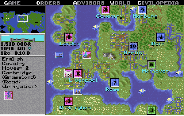 In this game, the player takes on the role of the ruler of a civilisation. They start with one, occasionally two, settler units and they attempt to build an empire in competition with two to seven other civilisations. The game requires a fair amount of micromanagement, although less than other simulation games. Along with the larger tasks of exploration, diplomacy and warfare, the player has to make decisions about where to build new cities, which improvements or units to build in each city, which advances in knowledge should be sought (and at what rate), and how to transform the land surrounding the cities for maximum benefit. From time to time the player’s towns may be harassed by barbarians, units with no specific nationality and no named leader. These threats only come from huts, unclaimed land or sea, so that over time and turns of exploration, there are fewer and fewer places from which barbarians will emanate. Before the game begins, the player chooses which historical or current civilisation to play. In contrast to later games in the ‘Civilization’ series, this is largely a cosmetic choice, affecting titles, city names, musical heralds, and colour. The choice does affect their starting position on the “Play on Earth” map, and thus different resources in one’s initial cities, but has no effect on starting position when starting a random world game or a customised world game. The player’s choice of civilisation also prevents the computer from being able to play as that civilisation or the other civilisation of the same colour, and since computer-controlled opponents display certain traits of their civilisations this affects gameplay as well. For example, the Aztecs are fiercely expansionist and generally extremely wealthy. Other civilisations include the Americans, the Mongols and the Romans. Each civilisation is led by a famous historical figure, such as Mahatma Gandhi for India. The scope of this Civilization game is larger than most others. That is because it begins in 4000BC, before the Bronze Age and can last through to AD 2100 on the easiest setting with Space Age and ‘future technologies’. At the start of the game there are no cities anywhere in the world and the player controls one or two settler units, which can be used to found new cities in appropriate sites. Those cities may build other settler units, which can go out and found new cities, thus expanding the empire. Settlers can also alter terrain, build improvements such as mines and irrigation, build roads to connect cities, and later in the game they can construct railroads which offer unlimited movement. As time advances, new technologies are developed. These technologies are the primary way in which the game changes and grows. At the start, players choose from advances such as pottery, the wheel and the alphabet, leading to, near the end of the game, nuclear fission and spaceflight. Players can gain a large advantage if their civilisation is the first to learn a particular technology (the secrets of flight, for example) and put it to use in a military or other context. Most advances give access to new units, city improvements or derivative technologies, for example the chariot unit becomes available after the wheel is developed, and the granary building becomes available to build after pottery is developed. The whole system of advancements from beginning to end is called the technology tree and this concept has been adopted in many other strategy games. Since only one technology may be researched at any given time, the order in which they are chosen makes a considerable difference in the outcome of the game and generally reflects the player’s preferred style of gameplay. Players can also build Wonders of the World in each of the epochs of the game, subject only to obtaining the prerequisite knowledge. These wonders are important achievements of society, science, culture and defence, ranging from the Pyramids and the Great Wall in the Ancient age to the Copernicus Observatory and Magellan’s Expedition in the middle period right up to the Apollo programme, the United Nations and the Manhattan Project in the modern era. Each Wonder can only be built once in the world, and requires a lot of resources to build, far more than most other city buildings or units. Wonders provide unique benefits to the controlling civilisation, for example Magellan’s Expedition increases the movement rate of naval units. Wonders typically affect either the city in which they are built, for example the Colossus, every city on the continent, such as J.S. Bach’s Cathedral, or the civilisation as a whole, like Darwin’s Voyage. However, some wonders are made obsolete by new technologies. The game can be won by conquering all other civilisations or by winning the Space Race, reaching the star system of Alpha Centauri. The game has developed quite a bit over the years though, as I have an excellent version on my MacBook Pro which is much improved from the MS-DOS version that I used to play!