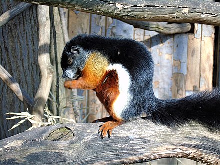 Squirrels are generally small animals, ranging in size from the African pygmy squirrel and least pygmy squirrel at 10 to 14 cm (3.9 to 5.5 in) in total length and just 12 to 26 g (0.42 to 0.92 oz) in weight, to the Bhutan giant flying squirrel at up to 1.27 m (4 ft 2 in) in total length, and several marmot species, which can weigh 8 kg (18 lb) or more. Squirrels typically have slender bodies with very long bushy tails and large eyes. In general, their fur is soft and silky, though much thicker in some species than others. The coat colour of squirrels is highly variable between, often even within, species. In most of the species the hind limbs are longer than the fore limbs, whilst all species have either four or five toes on each foot. The feet, which include an often poorly developed thumb, have soft pads on the undersides and versatile, sturdy claws for grasping and climbing. Tree squirrels, unlike most mammals, can descend a tree head-first. They do so by rotating their ankles 180 degrees, enabling the hind feet to point backward and thus grip the tree bark from the opposite direction. Squirrels live in almost every habitat, from tropical rainforest to semi-arid desert, avoiding only the high polar regions and the driest of deserts. They are predominantly herbivorous, subsisting on seeds and nuts, but many will eat insects and even small vertebrates. As their large eyes indicate, squirrels have an excellent sense of vision, which is especially important for the tree-dwelling species. Many also have a good sense of touch, with ‘vibrissae’