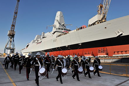 Royal Marines Band Service members beside HMS Duncan in 2010.